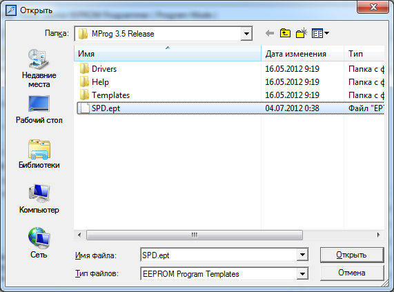 Для устранения этой проблемы следует выбрать пункт "Open" меню "File" и в появившемся диалоговом окне указать следующий файл SPD.ept и нажать кнопку "Открыть":