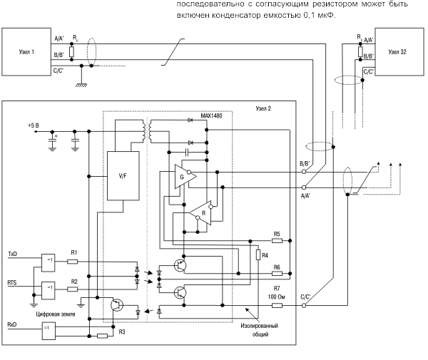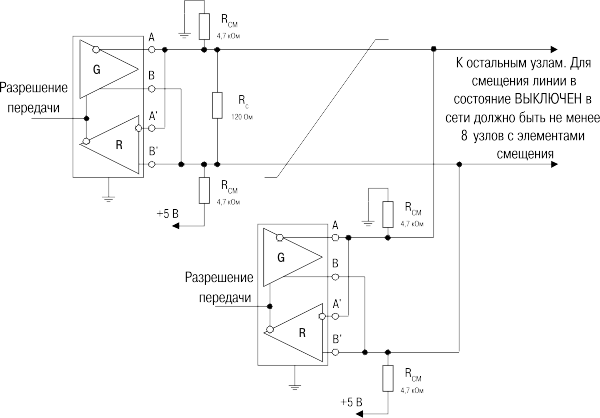 Рисунок 1 – Способ объединения приёмо-передатчиков EIA RS-485 с гальванической изоляцией
