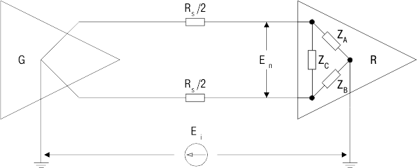 помехи, действующей между двумя проводниками кабеля, как правило, будет определяться степенью асимметрии полного импеданса относительно земли, если предположить,
