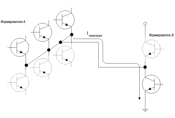 Ситуация, когда несколько формирователей нагружено на один, иллюстрируется на рисунке 7. По нижнему плечу формирователя В протекает суммарный ток от