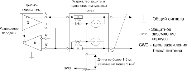 пределы допустимого диапазона, то при реализации сети на основе интерфейса RS-485 следует применять приёмо-передатчики с гальванической изоляцией.
