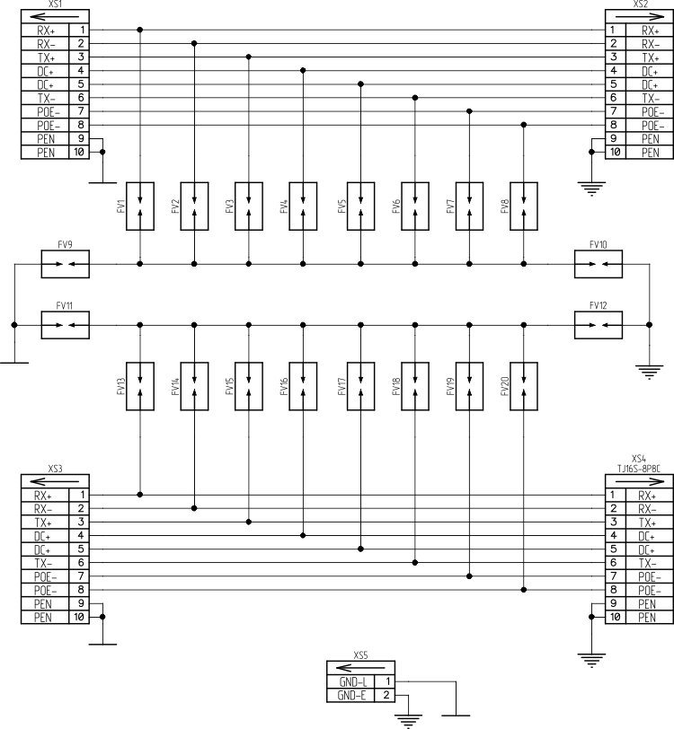Контакт GND-L гальванически развязан с общей точкой с помощью разрядника и соединён с экраном корпуса разъёма 8P8C (ХS1), предназначенного для подключения линий связи.