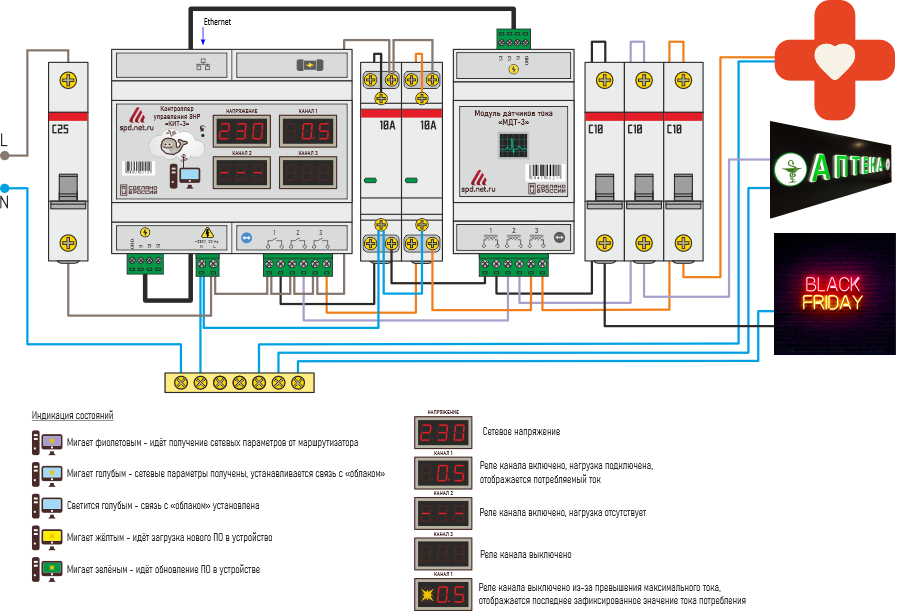 - Увеличение срока работы рекламной вывески за счёт своевременного отключения при выходе сетевых параметров за установленные пределы
