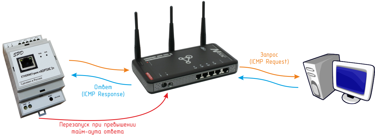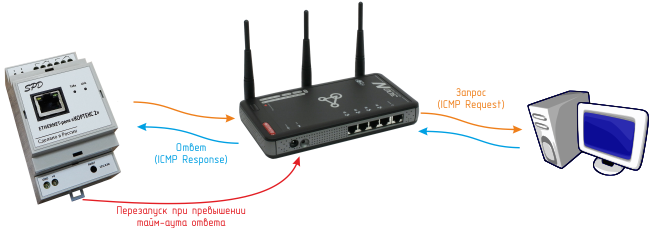 Устройство поддерживает ICMP-протокол (Echo-Request) для контроля доступности сетевого оборудования. В случае превышения тайм-аута ответа Ethernet-реле может автоматически перезагружать оборудование с помощью одного из своих электромагнитных реле.