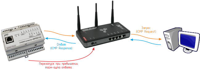 Контроллер поддерживает ICMP-протокол (Echo-Request) для контроля доступности сетевого оборудования. В случае превышения тайм-аута ответа контроллер может автоматически перезагружать оборудование с помощью одного из своих электромагнитных реле.