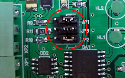 Устройство имеет внутренние подтягивающие резисторы и резистор-терминатор. Для включения этих резисторов необходимо установить три перемычки JP1, JP2 (подтягивающие резисторы) и JP3 (терминатор):