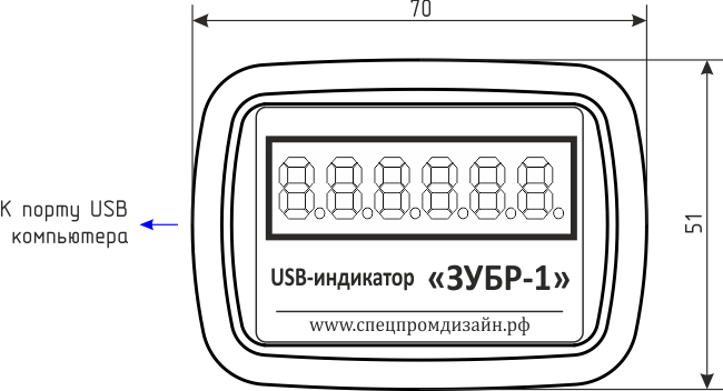 На лицевой панели расположен шестиразрядный 7-сегментный светодиодный инди-катор. На левой стенке корпуса находится разъём miniUSB для подключения USB-индикатора к компьютеру. Питается устройство непосредственно от USB-порта.