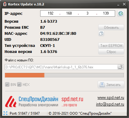 Если запись выполнена успешно, контроллер будет автоматически перезагружен. После этого в течение нескольких секунд устройство проверит новое ПО